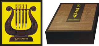 这套湖笔出自于中国制笔大师邱昌明之手。由其制作的湖笔具有“尖、齐、圆、健”四大特点,书画得心应手,挥洒自如。由于他对中国湖笔的特殊贡献,被中华人民共和国文化部确定为目前唯一的《国家非物质文化遗产》项目代表性传承人。理解、沟通、欢聚、合作,是2010年上海世博会的理念,也是主旋律。邱昌明大师与他的学生周瑾以琴为架,用笔代弦,两者相融,相得益彰,天衣无缝,充分诠释了世博会的理念。